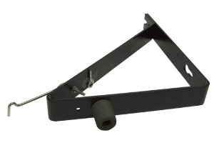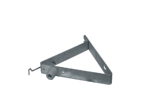 Deuropvangbeugel, driehoekig model. Geschikt voor montage aan de buitenmuur om een naar buiten draaiende deur op te vangen. Inclusief deurbuffer en windhaak.