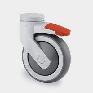 Zwenkwiel met dubbele rem, vork en wiel van hoogwaardig synthetisch materiaal, zwenklager met dubbele kogeldraaikrans, boutgat. Wielkern van polypropyleen met grijze niet-strepende TENTEprene thermoplastische rubberband, wielnaaf op precisiekogellager, met afdekkappen. Attentie: De wielen zijn vanaf 100 stuks ook met grijs rempedaal leverbaar.