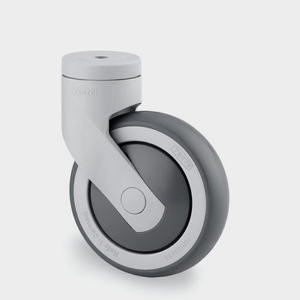 Zwenkwiel, vork en wiel van hoogwaardig synthetisch materiaal, zwenklager met dubbele kogeldraaikrans, boutgat. Wielkern van polypropyleen met grijze niet-strepende TENTEprene thermoplastische rubberband, wielnaaf op precisiekogellager, met afdekkappen