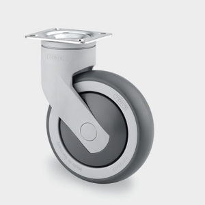 Zwenkwiel, vork en wiel van hoogwaardig synthetisch materiaal, zwenklager met dubbele kogeldraaikrans, plaatbevestiging. Wielkern van polypropyleen met grijze niet-strepende TENTEprene thermoplastische rubberband, wielnaaf op precisiekogellager, met afdekkappen